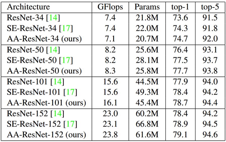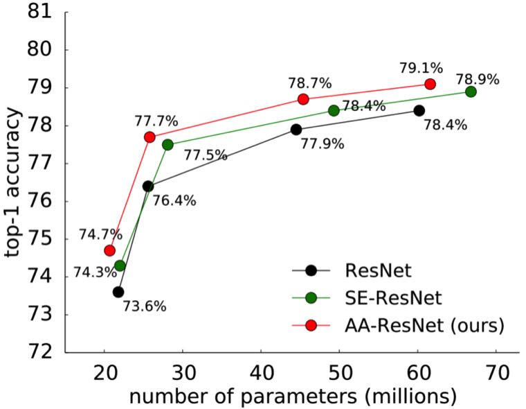 图 1:注意增强能系统性地改善不同规模的不同类型网络的图像分类结果。这里展示了不同参数量下不同模型的 ImageNet 分类准确度,其中 ResNet 是基准模型、SE-ResNet 使用了通道式注意增强、AA-ResNet 是本论文新提出的架构。