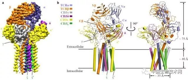 大多数成熟T细胞(约95%)的TCR由通过二硫键相连的α和β两条异二聚体肽链组成,TCRα/β的可变区(Vα和Vβ)负责识别抗原信号,TCRα/β与含有γ/ε、δ/ε’和ζ/ζ’六个亚基进行信号传递的共受体CD3组成TCR-CD3受体复合物,该复合物决定着T细胞的发育、激活以及对病原的免疫反应。在过去20年中,人们对TCR胞外可变区如何识别各种抗原进行了很深入的研究,但作为细胞免疫基础科学问题之一的TCR-CD3复合物组装以及信号转导的结构基础仍然未知。