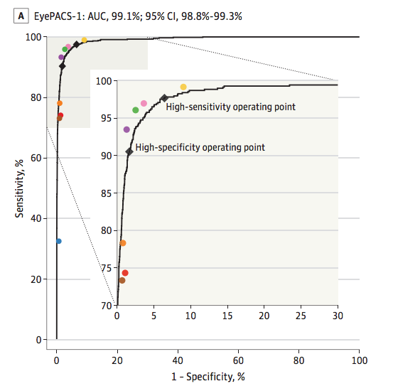 深度学习之所以比医生更有优势,是因为它们可以在各个“操作点”上运作,相同的系统可以执行高灵敏度筛选和高特异性诊断,不需要再加额外的训练。