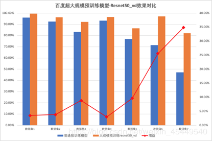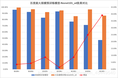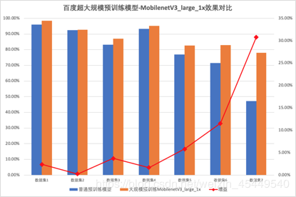 在图像分类模型中,使用百度超大规模预训练模型的Resnet50_vd相比普通模型在各类数据集模型效果上平均提升12.76%,使用百度超大规模预训练模型的Resnet101_vd,相比于普通预训练模型,平均提升13.03%,使用百度超大规模预训练模型的MobilenetV3_large_1x,相比于普通预训练模型,平均提升8.04%。