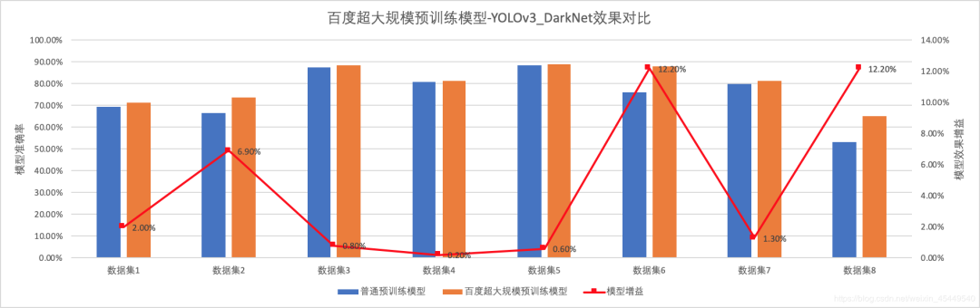 ,进行大规模训练所得,适应于各类物体检测应用场景。相对于普通使用公开数据集训练的预训练模型,在各类数据集上都有不同程度效果提升,模型效果和泛化性都有显著提升。