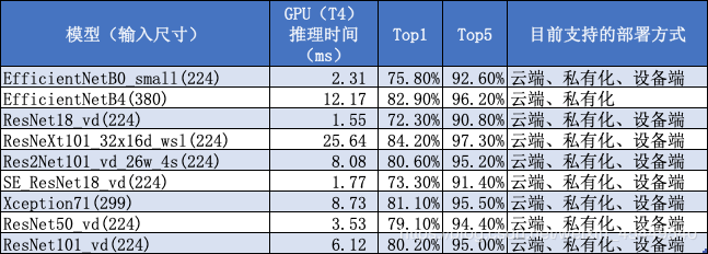 新增的分类模型的推理时间、效果,以及支持的部署方式如下表所示: