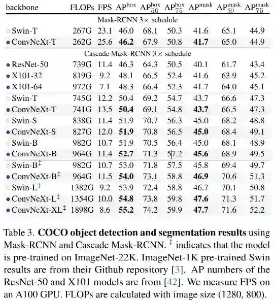 为进一步验证ConvNeXt在下游任务的表现,我们基于Mask R-CNN与Cascade Mask R-CNN在COCO检测方面的性能,结果见上表,从中可以看到:ConvNeXt取得了与SwinTransformer相当,甚至更优的性能。当采用更大的骨干且ImageNet22K预训练时,ConvNeXt的性能更佳。