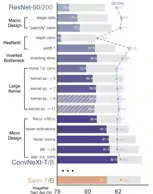 接下来,我们将提供从ResNet到ConvNeXt的演变轨迹。我们考虑了两种不同FLOPs尺寸的模型:ResNet50/Swin-T(FLOPs约 )与ResNet200/Swin-B(FLOPs约 ),为简单起见,这里仅呈现ResNet50/Swin-T复杂度模型的结果。