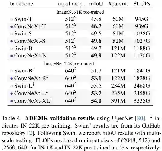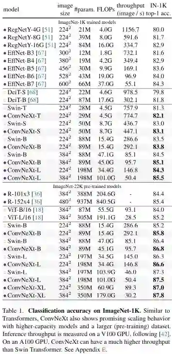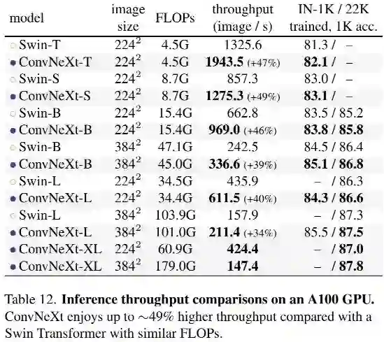 上表还给出了Swin与ConvNeXt在吞吐量方面的对比,很明显:ConvNeXt具有比Swin更高的吞吐量、更高的精度。
