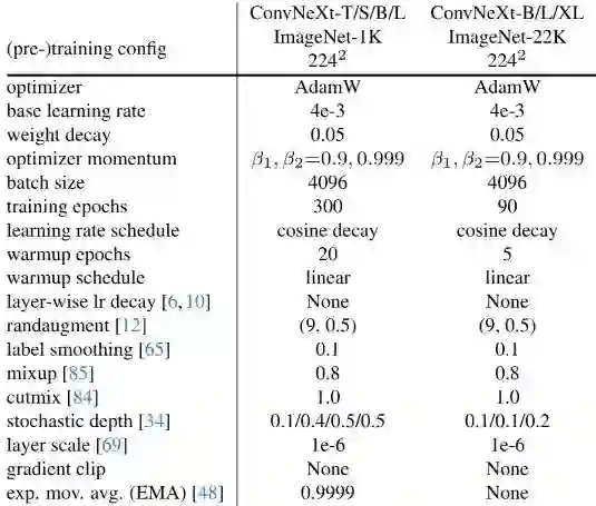 本文采用了DeiT与SwinTransformer的训练方案,可参见上表。训练周期从原始的90epoch扩展到了300epoch;优化器为AdamW,数据增广包含Mixup、Cutmix、RandAugment、RandomErasing;正则化技术包含Stochastic Depth与Label Smoothing。增强的训练技术将ResNet50的性能从76.1%提升到了78.8%,这说明:Transformer与ConvNet的性能差距很大比例源自训练技术的升级。
