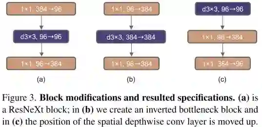 Transformer模块的一个重要设计:它构建了Inverted Bottleneck,如MLP的隐层维度是输入维度的4倍。有意思的是:Transformer的这种设计与ConvNet中的Inverted Bottleneck(最早源自MobileNetV2)设计相一致。