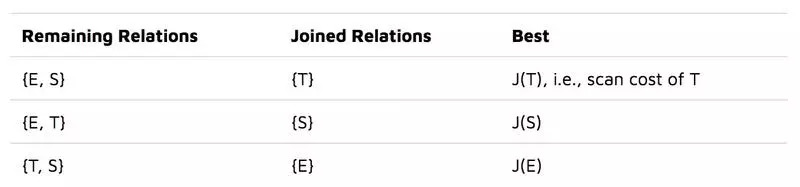 然后,它基于这些信息枚举所有二元关系。例如,在计算{E,S}连接的最佳成本时,它会查找先前相关的计算结果: