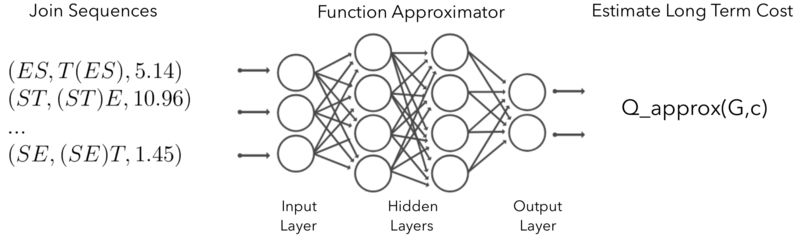 图 1:使用神经网络逼近 Q 函数。输出的意思是“如果我们在当前查询图 G 上进行连接 c,那么最小化长期连接计划成本是多少?”