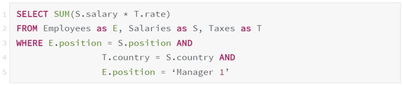 假设一个数据库包含三张表:Employees、Salaries 和 Taxes。下面这个查询用于找出“所有 Manager 1 员工的总税额”: