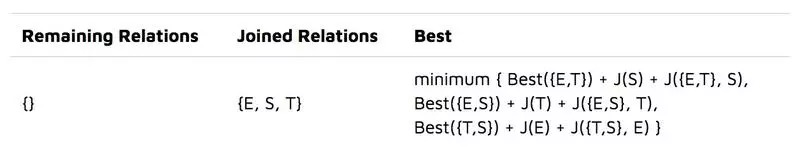 这个算法遍历其他二元关系集,最终找到连接所有三张表的最佳成本。这需要在二元关系和基本关系的所有可能“left-deep”组合中取最小值: