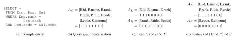 图 2:查询及其相应的特征化。我们假设一个包含 Employees、Positions 和 Salaries 三张表的数据库。图中显示了部分连接和完全连接。(G,c) 的最终特征向量是 A_G(查询图的属性)、A_L(左侧的属性)和 A_R(右侧的属性)的串联。