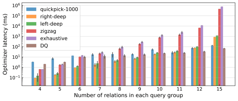 图 4:所有 113 个 JOB 查询的优化器延迟,按查询中的关系数量进行分组。误差棒表示平均值附近的±标准偏差。共进行了 5 次试验。