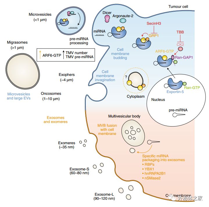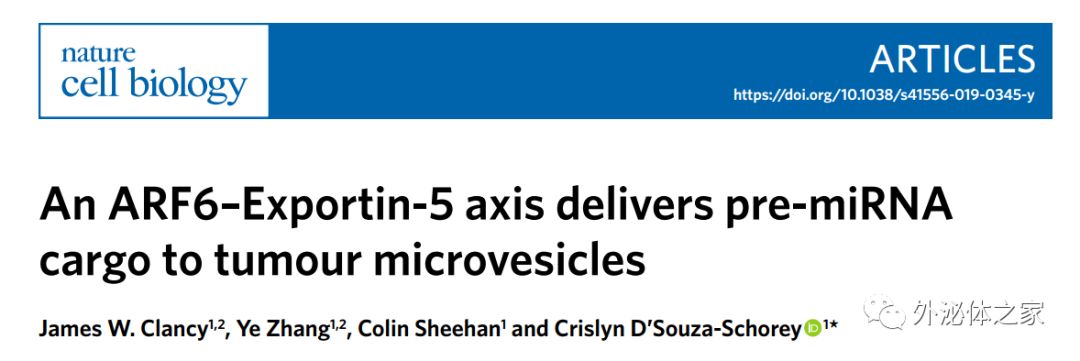 参考文献:James W. Clancy, Ye Zhang, Colin Sheehan & CrislynD’Souza-Schorey. An ARF6–Exportin-5 axis delivers pre-miRNA cargo to tumour microvesicles. Nature Cell Biology (2019) DOI: 10.1038/s41556-019-0345-y