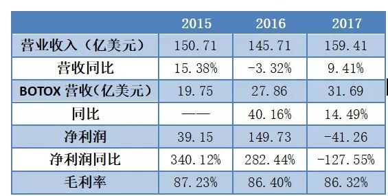 以肉毒素为例,目前通过国家食药监局正式批文的A型肉毒素的只有两家,一家是美国艾尔建医疗(Allergan,AGN.NYSE)生产的A型肉毒素BOTOX,每100单位的价格范围在6000-8000元,一家是兰州衡力生产的注射用A型肉毒素,每100单位价格在2000-3000元之间。根据美国艾尔建医疗的年报,其肉毒素产品的毛利率高达60-80%,公司综合毛利率都在80%以上,公司2016、2017年业绩出现下滑甚至大幅亏损的原因是有两个产品的专利期过期,独家专利经营权失效,但肉毒素BOTOX的销售依旧保持稳定,2017年实现销售收入31.69亿美元,同比增长14.49%,是艾尔建公司销售额最大的产品(表7)。