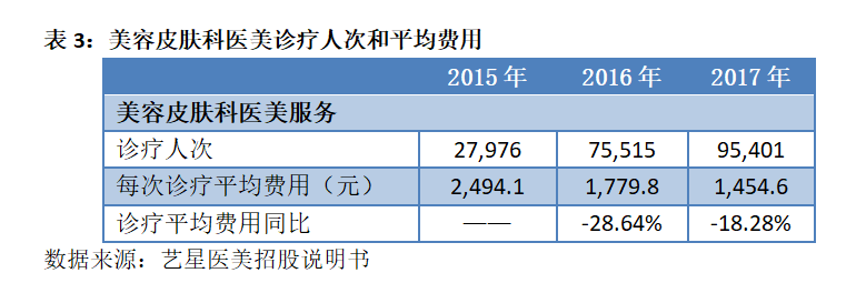 从2015年到2017年,艺星医美每一项业务的诊疗平均费用都在逐年下降,其中注射医美两年的降幅达到45%,主要原因注射医美的进入门槛相比外科整形手术要低很多,危险性也要低很多,导致很多中小型医美机构,甚至黑诊所都设立了注射医美项目,行业竞争加剧,很多大型医美机构都采取了降价的措施以吸引更多的客户。