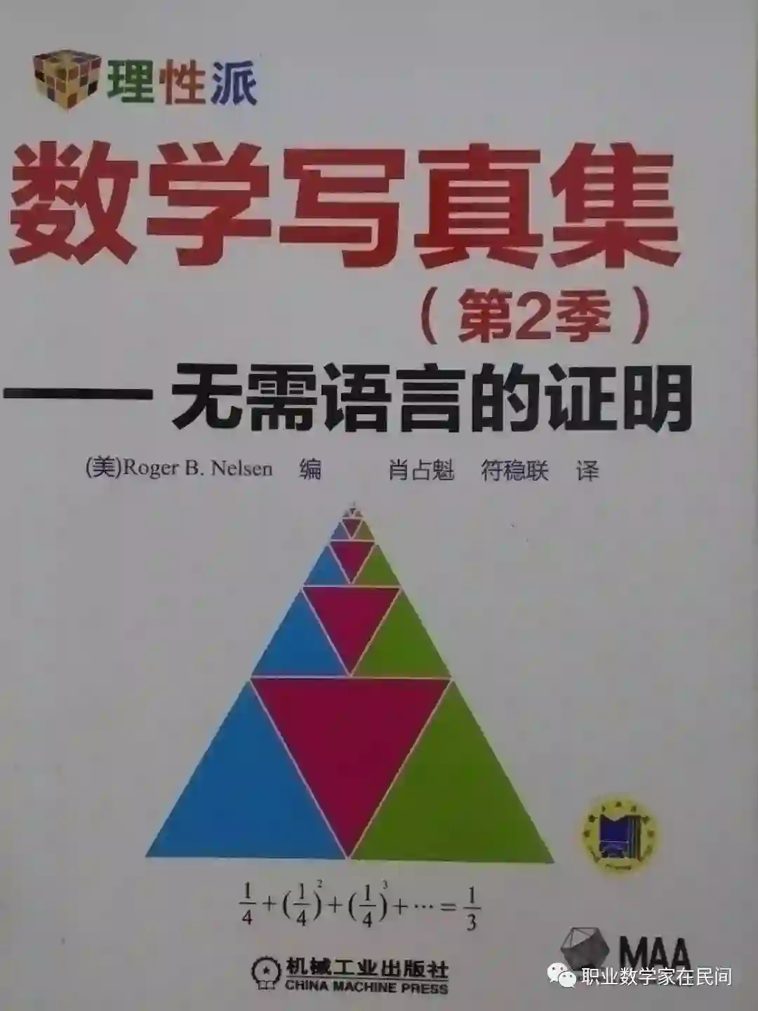 这是一套(2本)非常非常优美的数学书,书中展示了大量的数学定理,代数或三角公式,不等式,组合恒等式,其中大部分都是中学的数学知识。所有的这些数学知识都是用几何的办法来证明,正如书名所示,每个证明都没有文字,只是一副几何或组合图,比如封面就是一个恒等式的组合证明。正是这一副图就可以告诉你为什么这些定理,公式,不等式是对的。可以说这本书展示了数学非常直观的一面。甚至您看完后可能会怀疑是不是每个数学知识背后都有一个几何背景。如果数学老师在课堂上用这种风格来讲数学知识,何愁学生不喜欢数学。不过也不是每个图形证明都容易看懂,积极的读者可以挑战一下,看看自己能看懂多少个图形证明。