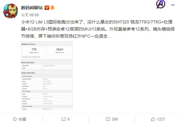 另外,据 @数码闲聊站 爆料,小米 12 Lite 不仅有骁龙 778G,还有骁龙 778G+ 版本,预装了 MIUI 13 系统,外观为小米 12 家族式设计。该手机还配备了屏下指纹、双扬声器、红外、NFC 等我们熟悉的硬件。值得一提的是,小米 Civi 产品经理胡馨心此前曾证实小米 12 青春版已经“没有”了,那么小米 12 Lite 或许不在国内发布,也可能会采用新的命名方式。