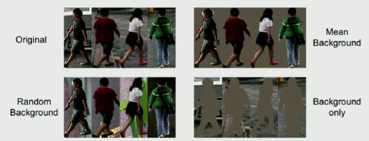 与 query 图片有相似背景但不同行人的图片排在 rank 6,而同一行人不同背景的图片却排在 rank 25。那么在行人重识别中,背景到底会带来多大的偏差呢?李鸿升等人通过在 CUHK03 和 Market-1501 数据集上使用 human parsing mask 的方法获得了 3 类数据集:mean background、random background 和 background only,如下图所示: