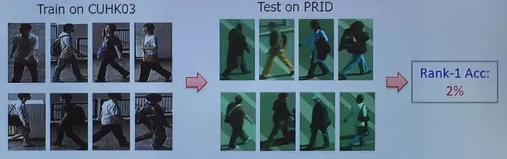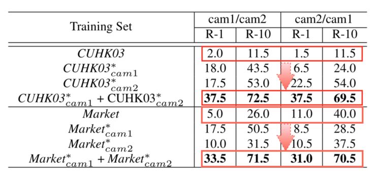 解决训练集和测试集严重不均衡的问题,张史梁等人认为一个可行的思路就是重用已有的标注数据。例如在 PRID 中训练集较少,那么可以利用 CUHK03 的数据集进行训练,然后在 PRID 中进行测试。但是这种方法并不像想象的这么容易,例如上面的例子,Rank-1 精度只有 2%。思考其背后的原因,可能是因为在这两个数据集中有不同的光照、背景、相机参数等。