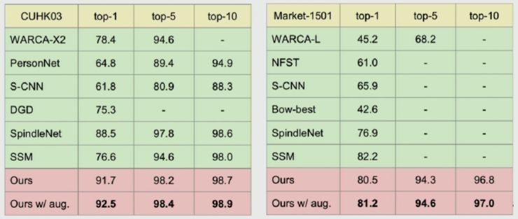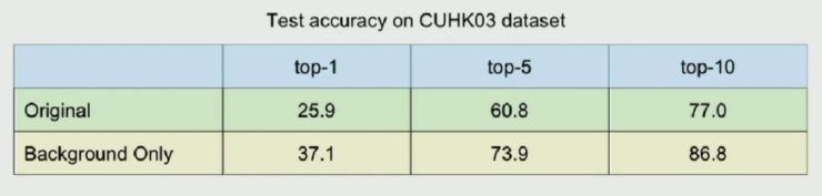 发现前者的表现并不差。这说明在之前深度学习模型中背景起到了相当大的影响,也同时给行人重识别带来了偏差。