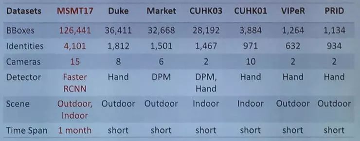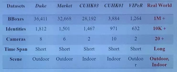 事实可能是并没有。对比大多数实验中所使用的数据集和真实世界的数据集,就可以发现仍然存在着很大的差别。例如下表中的五个已有的公开数据集 Duke、Market、CUHK03、CUHK01、VIPeR 与真实世界数据集的对比: