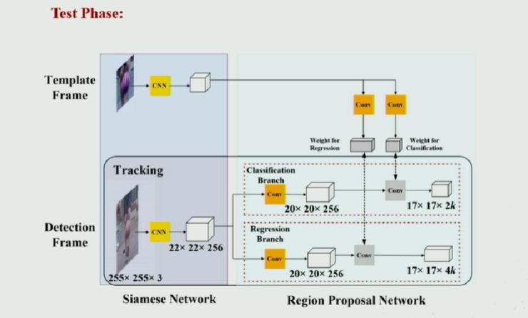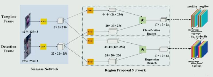 整体上,算法分为 Siamese 特征提取网络和 Region Proposal Network 子网络两个部分。二者通过卷积操作升维,统一在一个端到端的框架里面。
