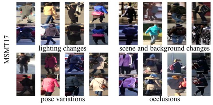 从上图中可以看出 MSMT17 的相比于其他数据集的一些优势。构建这个数据集共使用了 15 个相机,其中 12 个为 outdoor,3 个为 indoor;总共收集了 180 个小时的数据,每个月选择天气环境不同的 4 天,每天早、中、晚分别 3 个小时。他们选择 Faster RCNN 对这些行人进行 bounding box detection,这个标注过程花了两个月的时间,一共有 126441 个 body boxes。为了模拟真实世界中的环境,他们选择了 4101 个对象,其中 1041 个人用作训练,3060 个人用作测试。该数据集目前已经公开,可以说是该研究领域最大的数据集。