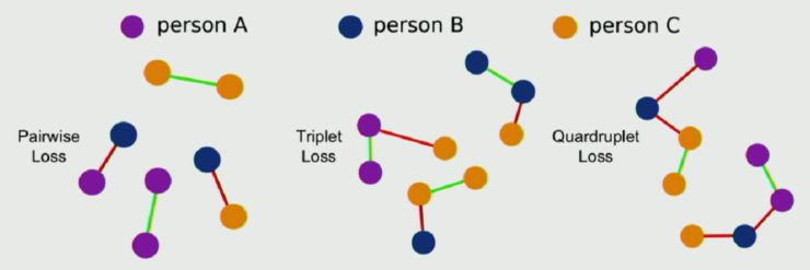 现有方法在通过深度神经网络学习视觉相似性时,一个局限性问题是在其 loss 函数中只用了局部约束。例如下图所示的 pairwise loss、triplet loss 或者 quardruplet loss: