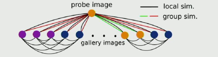 如上图所示,局部相似性仅仅考虑两幅图之间的相似性,而全局相似性则考虑 gallery images 中群组之间的相似性(probe image 也可以视为一个 group)。其方法的框架如下图所示:
