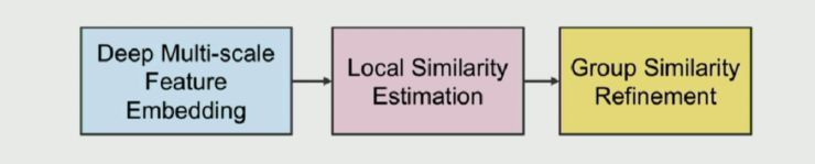 共分为三步:先进性深度多尺度 feature embedding(使用了 ResNet-50 作为主体网络),然后对图片进行一个局部的相似性估计(得到两张图片 I_m,I_n 的局部预估计相似性为 t_mn),最后一步为组相似性增强。