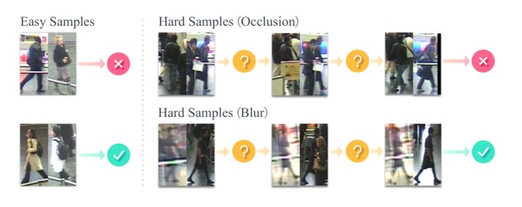 如上图所示,左侧两张图片可以很容易检测出是否是同一个人,因此期望设计出的模型只是用一对图片做判别即可;而另一方面,右侧的图片,由于遮挡、模糊的原因,一对图片很难判断是否是同一个人,因此希望模型能够自动地选择适量的图片对进行行人身份判断。