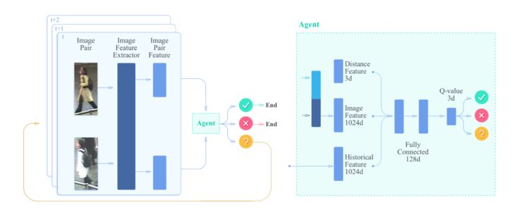 (1)Actions。图片对生成的 feature 送入 agent 后,agent 将作出三种判断:same,different 和 unsure。当判断结果为 unsure 时,就会返回到开头重新进行判断。