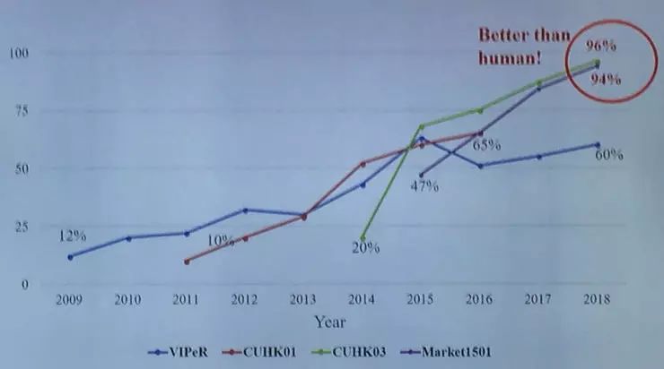 从 2005 年行人重识别任务首次提出后,经过 2014 年深度学习被引入该领域,行人重识别的研究得到大量的研究(例如 CVPR 上行人重识别的文章从 2014 年的 3 篇剧增到今年的 32 篇),在这些研究中各种模型所表现出的性能也逐步提升,在今年的一些数据集(例如 CUHK03、Market501)上一些方法的表现甚至超越了人类。