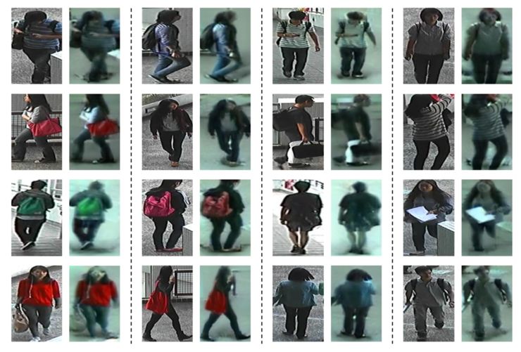 下面变换前后的对比图之一,从 CUHK03 到 PRID-cam2 的变换: