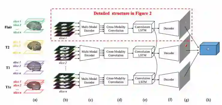 图1 系统框架:(a)根据切片为每个3D核磁共振形态(Flair, T2, T1, T1c)提取切片,(b)相同深度的4个切片被堆叠在一起,(c)每个堆里面4个切片被放到多形态编码器里面学习隐藏语义特征表示,(d)利用交叉形态卷积来聚合不同形态的信息,(e)利用卷积LSTM来对连续的切片建模,(f)解码网络用来对卷积LSTM的输出进行上采样,获得和输入图像一样的分辨率,(g)最后的结果是对每个像素位置预测肿瘤类型,(h)堆叠2D的预测结果到3D的分割。