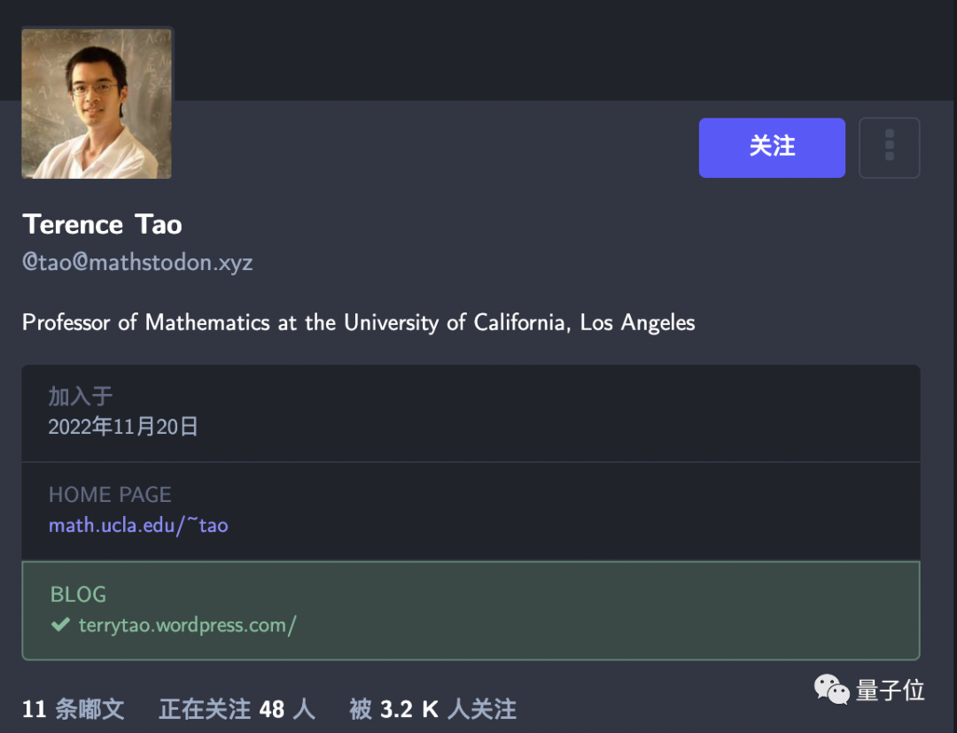 11月20日,陶哲轩正式入驻Mastodon,截至目前,陶哲轩已发布11条嘟文,获得3.2k关注者。