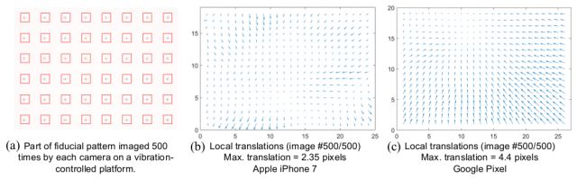 图3:(b)和(c)展示了Apple iPhone 7和Google Pixel的对齐平移量。