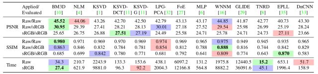 2)分析和验证了本文数据集的可靠性,测试了一些目前常用的降噪算法在本文数据集山上的表现,同时发现使用SIDD训练的CNN降噪模型效果更好。