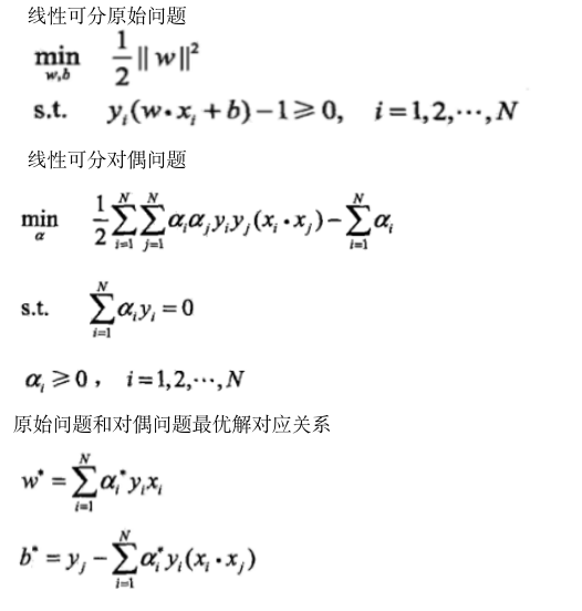 为了更容易地求解支持向量的优化问题,和自然地引入核函数,应用拉格朗日对偶性将原始问题转化为对偶问题进行求解,线性可分svm原始问题与对偶问题对应关系如下: