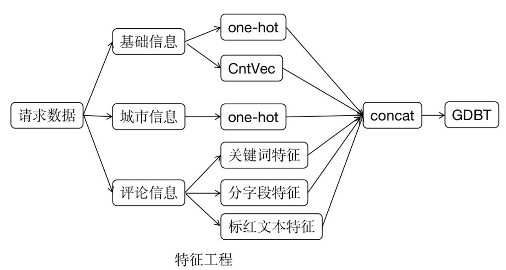 在内容审核中,对于不同的文本进行不同的处理,对于基础信息的类型字段做onehot特征处理,标签字段counter2vector特征处理,以及城市字段做onehot特征处理,对于内容详情分字段处理特征,关键词特征,从人工审核人员标红的内容中提取tfidf特征等,具体如下图所示: