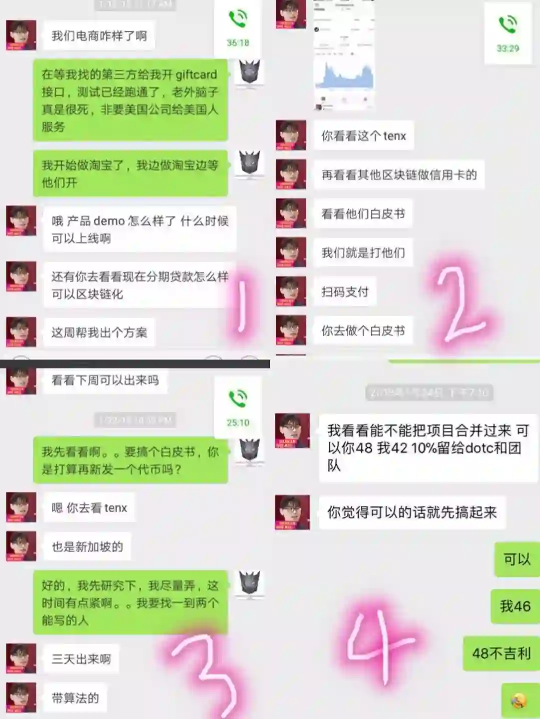 图1、2、3为石一与陈恩永的对话,石要求孙三天之内写出白皮书;图4为石一与孙高峰的对话,石劝其把项目合并过来先一起搞(SAY)。
