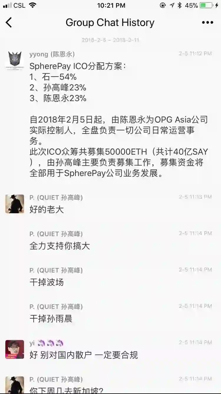据微信群的聊天记录显示,2月5日,陈恩永给出了SpherePay ICO分配方案:其中石一54%,孙高峰23%,陈恩永23%。
