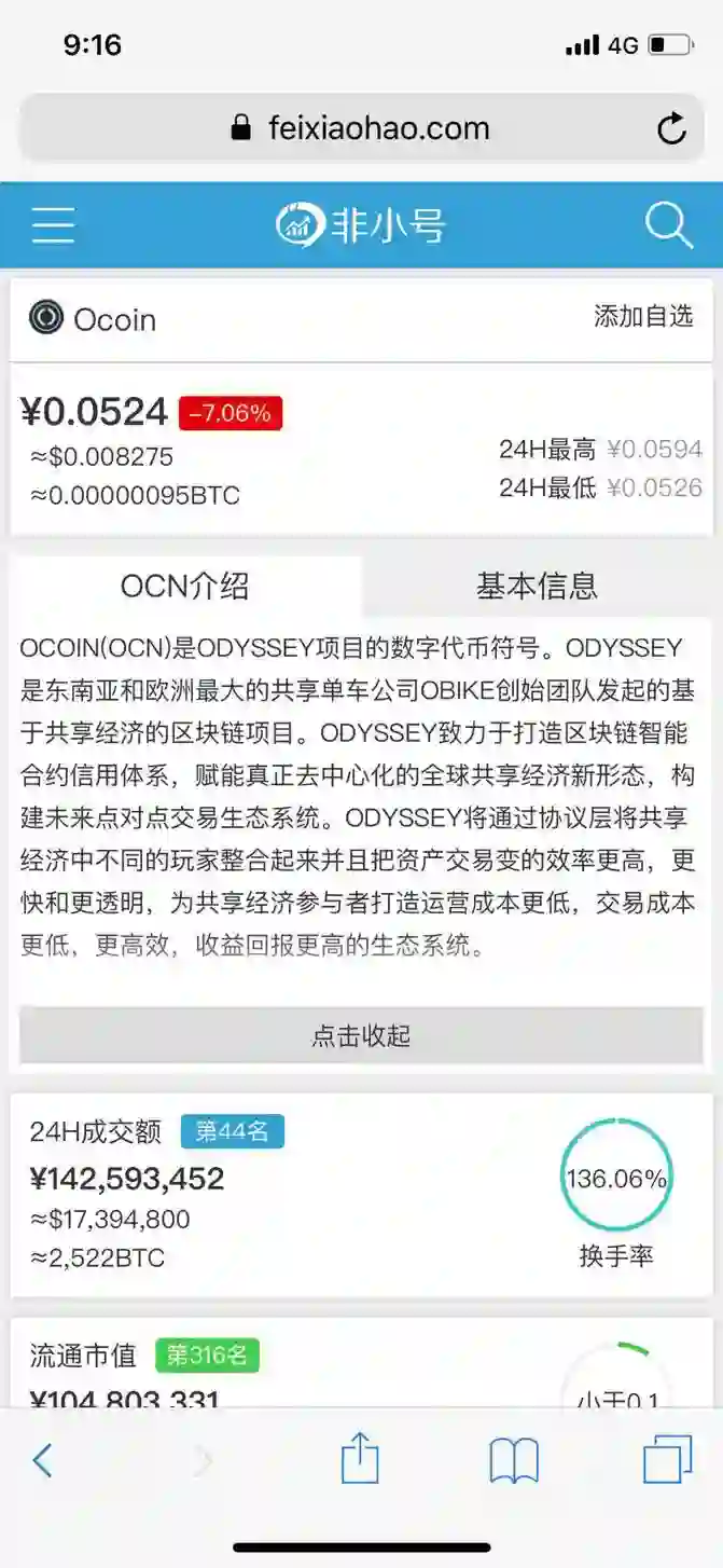 这一说法与公开资料透露的信息相悖。据数字货币行业大数据平台“非小号”介绍,OCN的发币主体Odyssey是东南亚和欧洲最大的共享单车oBike创始团队发起的基于共享经济的区块链项目。