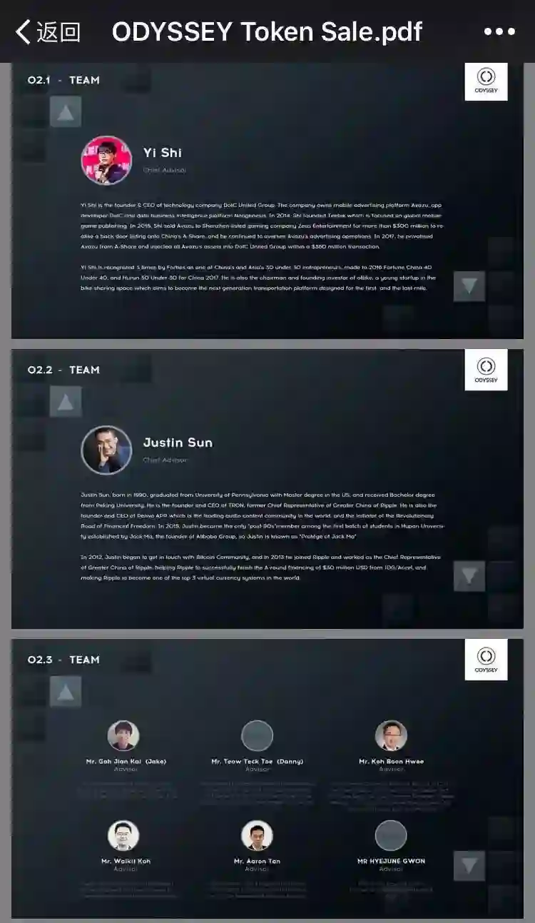 孙高峰则向铅笔道出具一份Odyssey token Sale的白皮书(即OCN白皮书),在Team介绍一栏,出现的首个名字便是石一,其次为Justin Sun,即波场孙宇晨。二人的Title的皆为首席顾问——而最令人扑朔迷离之处也在于此。