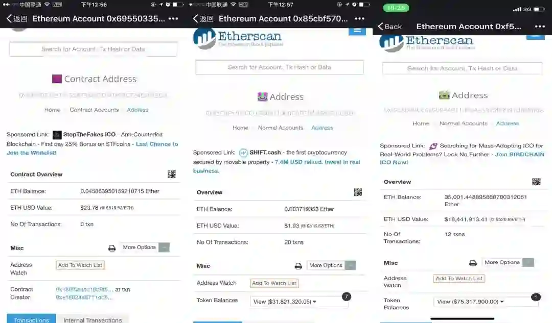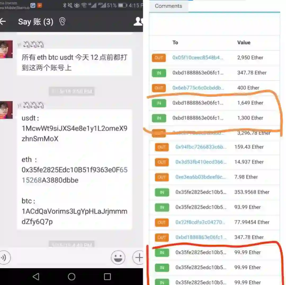 从左到右依次为孙高峰给出的石一的钱包地址,他称在OCN私募5万ETH,石一私下转移了4万个。