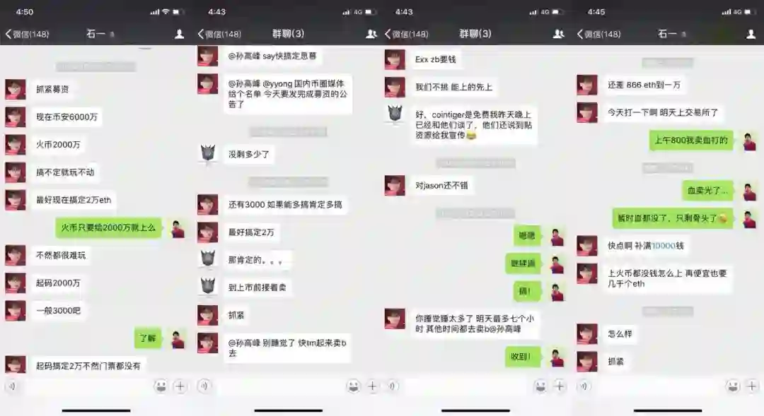 “抓紧募资,现在币安要6000万元,火币2000万元,搞不定就玩不动,最好现在搞定2万ETH。”在孙高峰出示的聊天记录中,石一的话语中满是焦虑。