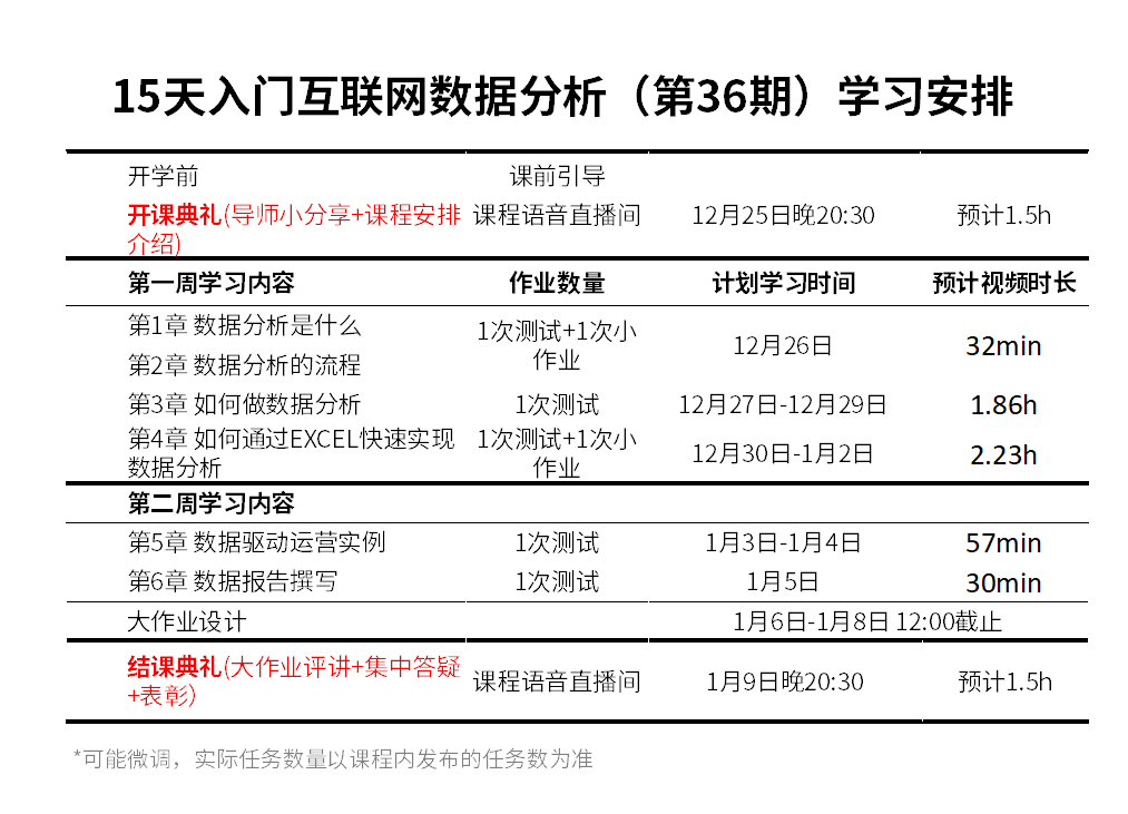 完整的课程学习由视频学习+章节小作业/测试+大作业+提问/答疑组成学习安排可以参考下方课程表: