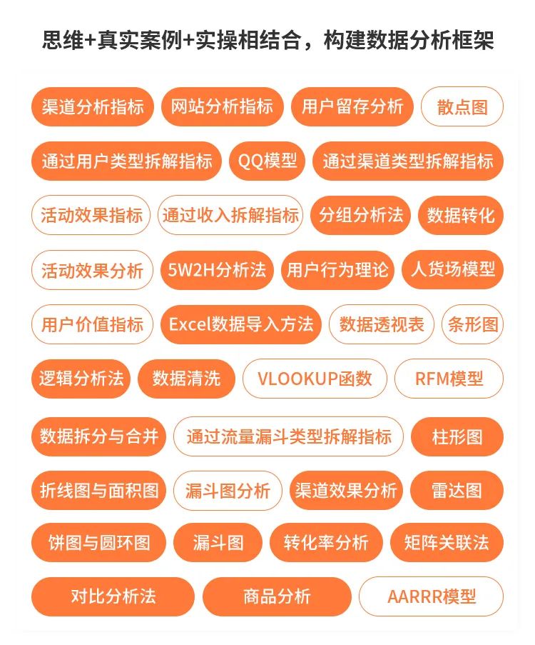 课程内容涵盖AARRR、RFM模型、QQ模型、用户行为理论、人货场模型等常用的数据分析框架以及常用的数据分析法。让你在15天时间充分涉猎足够广的知识与方法。