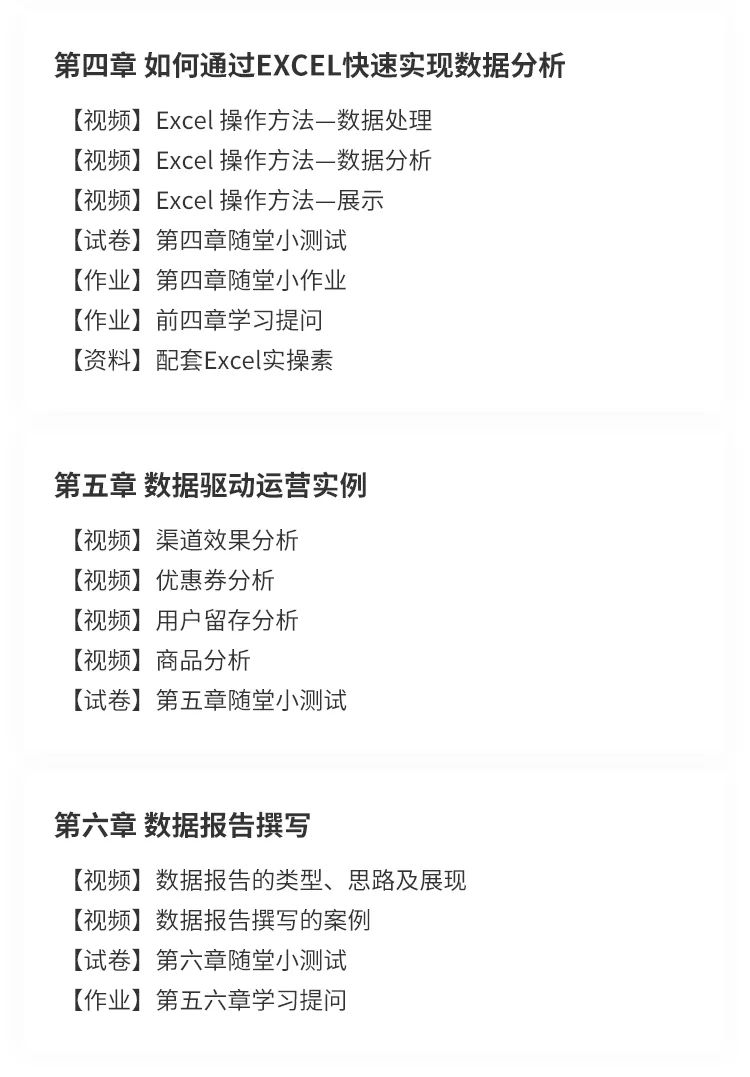 导师通过亲身经历的多个数据驱动运营实战案例分享,教你如何在常见问题的分析中建立数据驱动思维,以下数据分析方法课程将全覆盖。